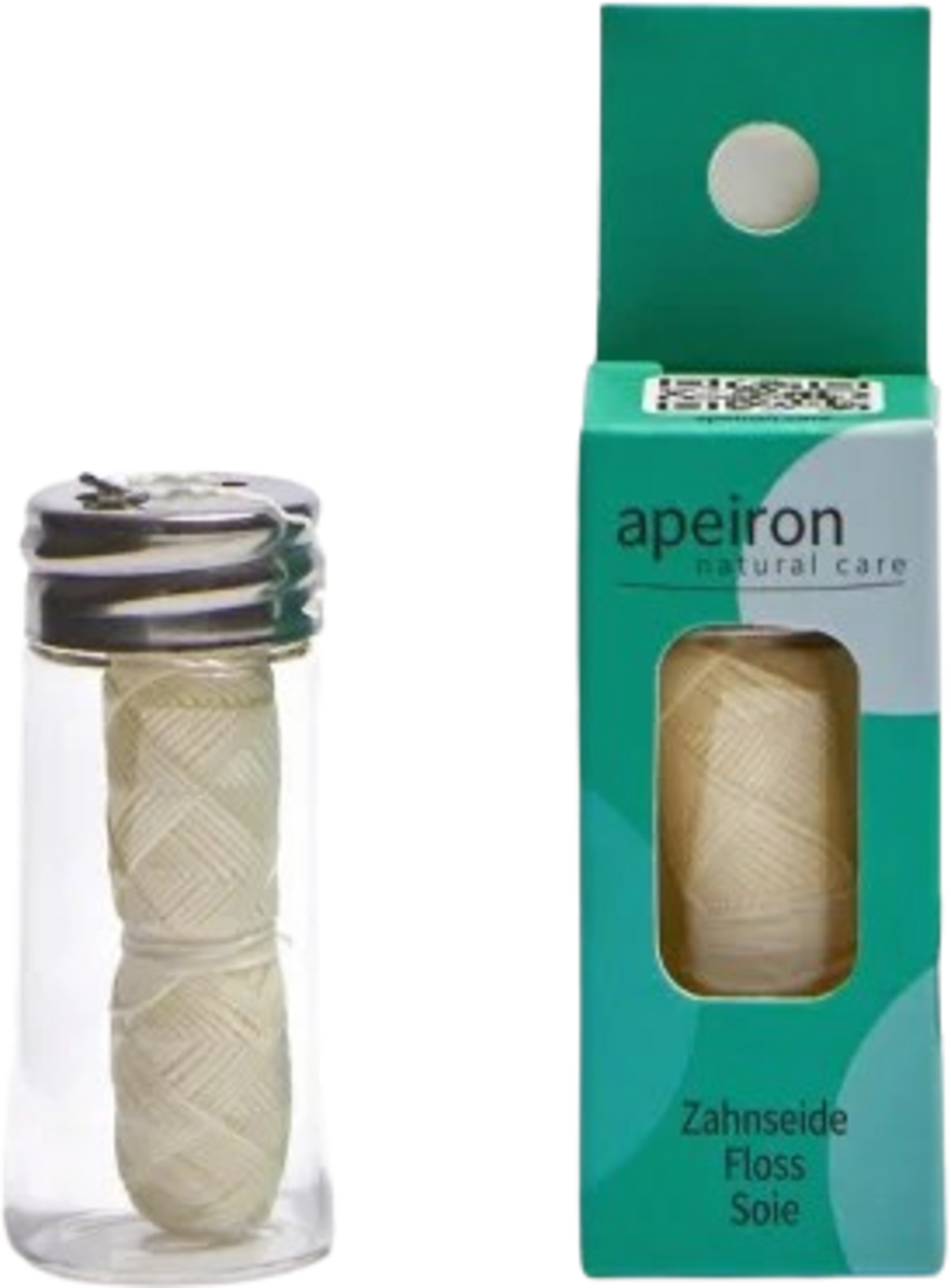 Esta alternativa vegana y ecológica de Apeiron está fabricada con ácido poliláctico, derivado del maíz y biodegradable. La cera limpia suavemente entre los dientes y las partículas de comida se adhieren fácilmente a su superficie ligeramente más rugosa. El hilo dental viene en un pequeño envase de cristal.