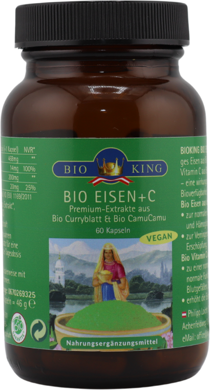 Las cápsulas de BioKing contienen hierro de hoja de curry orgánico y vitamina C de polvo de fruto de camu camu orgánico. La combinación de ingredientes de origen vegetal se produce utilizando métodos de procesamiento suaves. El producto es 100% ecológico y no contiene aditivos sintéticos.