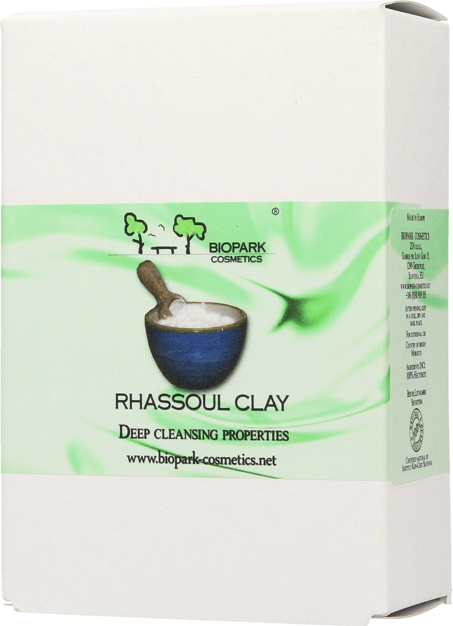 La arcilla Rhassoul de Marruecos tiene un color gris a rojizo y una textura muy fina. Es rica en magnesio, potasio, sílice y calcio, y también contiene pequeñas cantidades de hierro, aluminio y sodio. La arcilla de Biopark tiene un color muy claro y se corresponde con la mejor calidad.