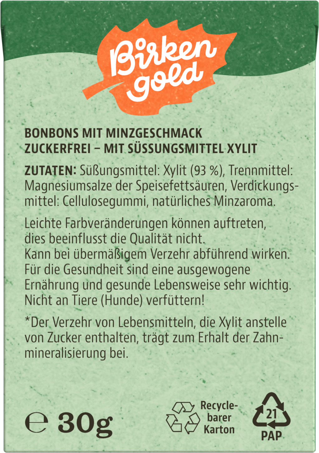 ¡Los caramelos de menta de Birkengold® están certificados como "respetuosos con los dientes"! Al estar endulzados exclusivamente con xilitol, una sustancia que ayuda a combatir las caries y a la remineralización de los dientes, son perfectos para saciar tu antojo de dulces en cualquier momento del día. Además, la práctica caja los hace ideales para llevarlos siempre en el bolsillo, bolso o mochila. Los caramelos también están disponibles en sabor a naranja.