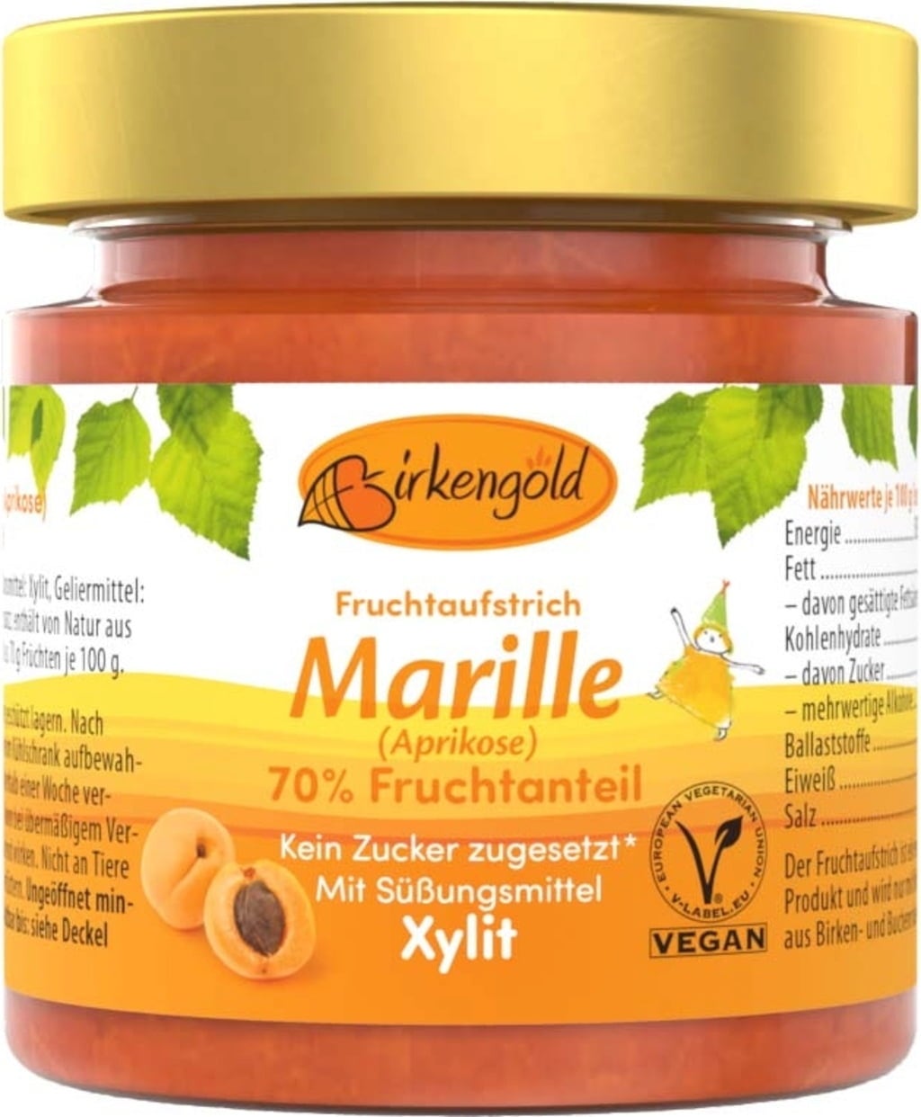 Una verdadera delicia: 70 % de contenido de fruta, endulzado exclusivamente con xilitol de Birkengold® y pectina de manzana para una consistencia perfecta. ¡Los paladares entendidos lo apreciarán! Sólo se procesan albaricoques de cultivo orgánico; las frutas contienen azúcar de forma natural. La crema para untar es ideal para pasteles dulces y salados, pero también combina bien con yogur.