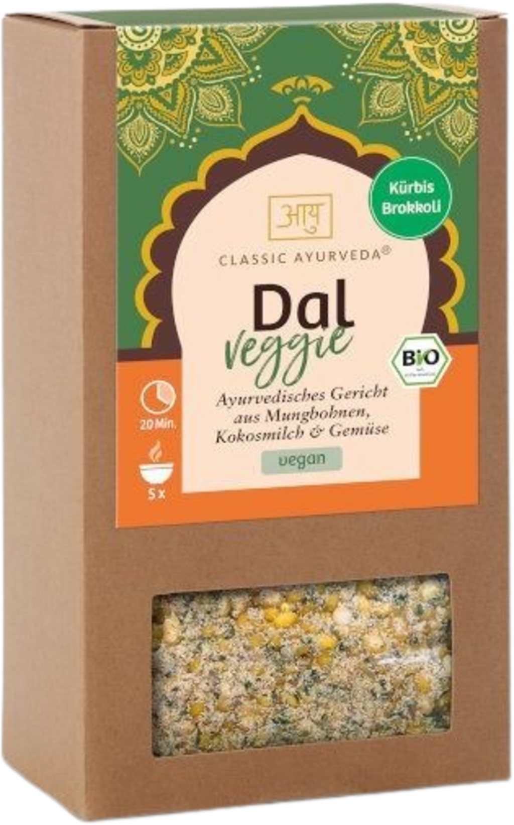 El Dal Bio - Veggie de Classic Ayurveda es una mezcla a base de alubias mungo amarillas peladas, que crean una base cremosa y con un sabor intenso. La mezcla incluye una selección de verduras como calabaza, brócoli, zanahorias, puerro y cebolla, armonizadas con la presencia de leche de coco en polvo. Una combinación de especias finamente equilibrada con comino, jengibre, hojas de cilantro, semillas de mostaza, chile y asafétida le confiere un perfil aromático equilibrado. El plato está compuesto exclusivamente por ingredientes naturales procedentes de la agricultura ecológica controlada y está pensado como fuente vegetal de proteínas.