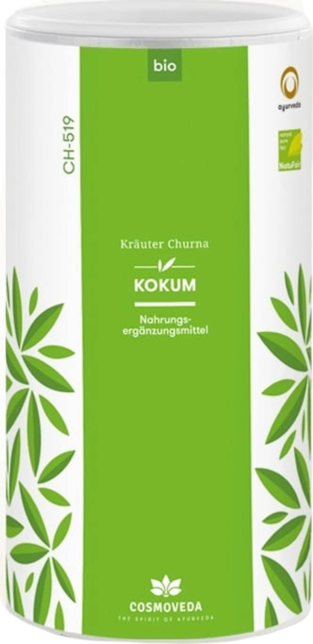 Kokum - Garcinia indica - es un árbol de tamaño mediano de hojas verdes y frutos grandes de color marrón, cuyas semillas ricas en grasa, proporcionan la kokum. En la dieta ayurvédica se utilizan las frutas y las semillas. Para la producción de este polvo se ha tenido en cuenta un molido suave (por debajo de 40° C) de frutos secos de proyectos ecológicos y de comercio justo de la India y Sri Lanka.