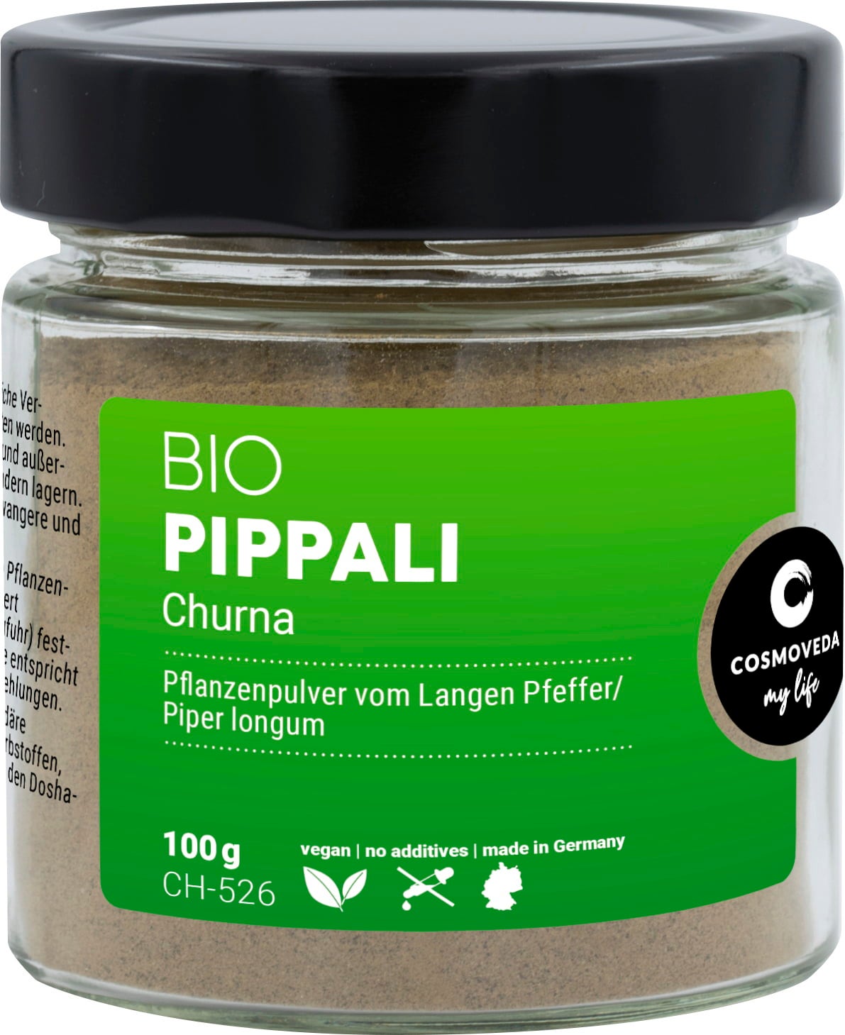 Pippali - Piper longum - es una clase de pimienta larga y delgada, aromática que proviene de una planta perenne, de raíces de madera cuyas hojas pueden alcanzar los 2,5 a 3,5 cm de largo. Sus frutos pueden alcanzar los 5 mm de grueso y su color es negro y verdoso. En la dieta ayurvédica se utilizan los frutos tanto maduros como inmaduros, así como las raíces. En la producción de este polvo, se ha tenido en cuenta un molido suave (por debajo de 40° C) de frutos secos de plantaciones de la India y Sri Lanka. Las plantaciones son de comercio justo y ecológicas.