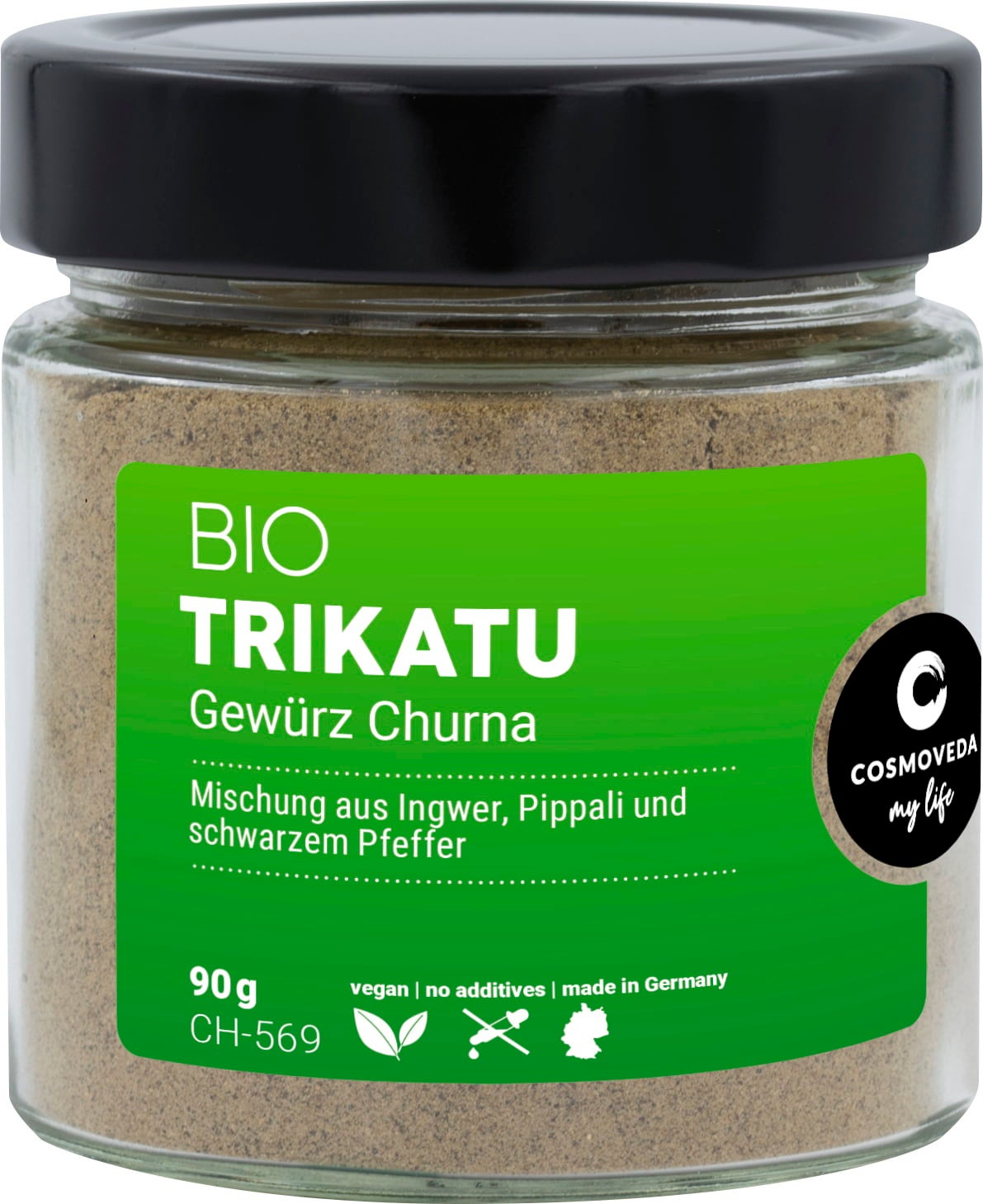 El Trikatu Churna Bio contiene una mezcla de pimienta negra y larga (Piper nigrum y Piper longum) y jengibre (Zingiber officinale). Estos ingredientes se muelen fina y suavemente por debajo de los 40 °C y se mezclan de manera tradicional.