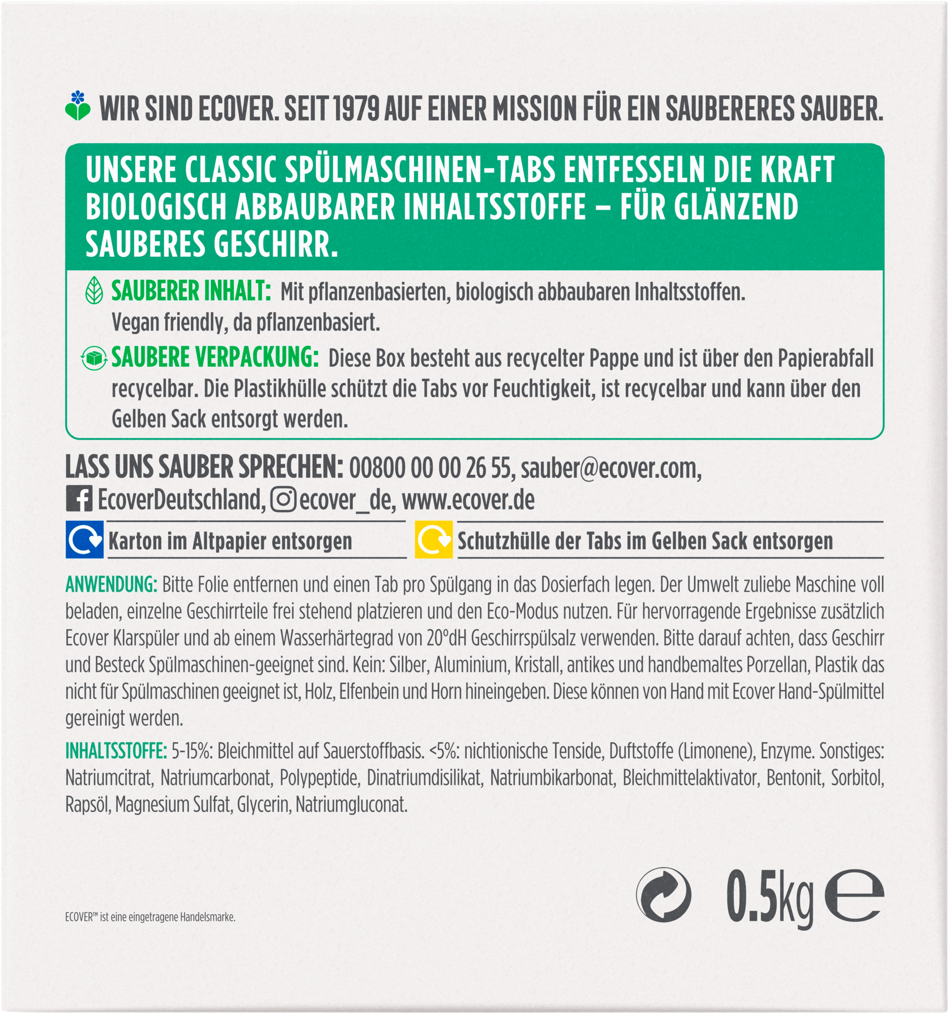 Pastillas para el lavavajillas que eliminan con eficacia los residuos de los alimentos con la ayuda de agentes tensioactivos de celulosa obtenidos en un procedimiento de bajo consumo de materias primas renovables. Están libres de fosfatos por lo que no resultan perjudiciales para el agua. Todos los ingredientes tienen base vegetal y mineral y son aptos para veganos.