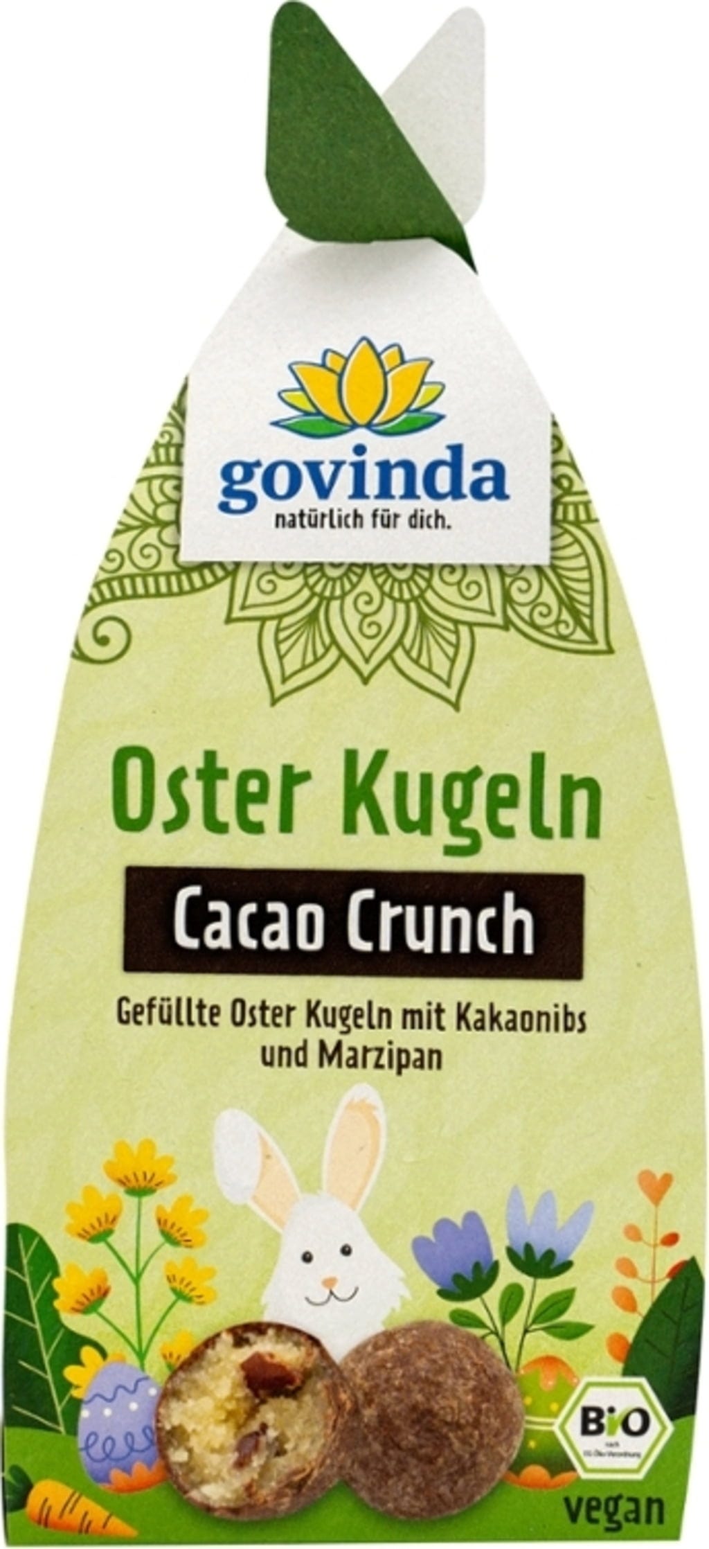 Las bolitas de Pascua Cacao Crunch de Govinda combinan fino mazapán y pasta de dátiles afrutada con un toque de caramelo salado. Recubiertas de chocolate, ofrecen una textura cremosa y armoniosa, elaboradas en la fábrica interna con ingredientes ecológicos. Esta receta vegana aporta variedad a la época de Pascua y es ideal como pequeño detalle o para compartir.
