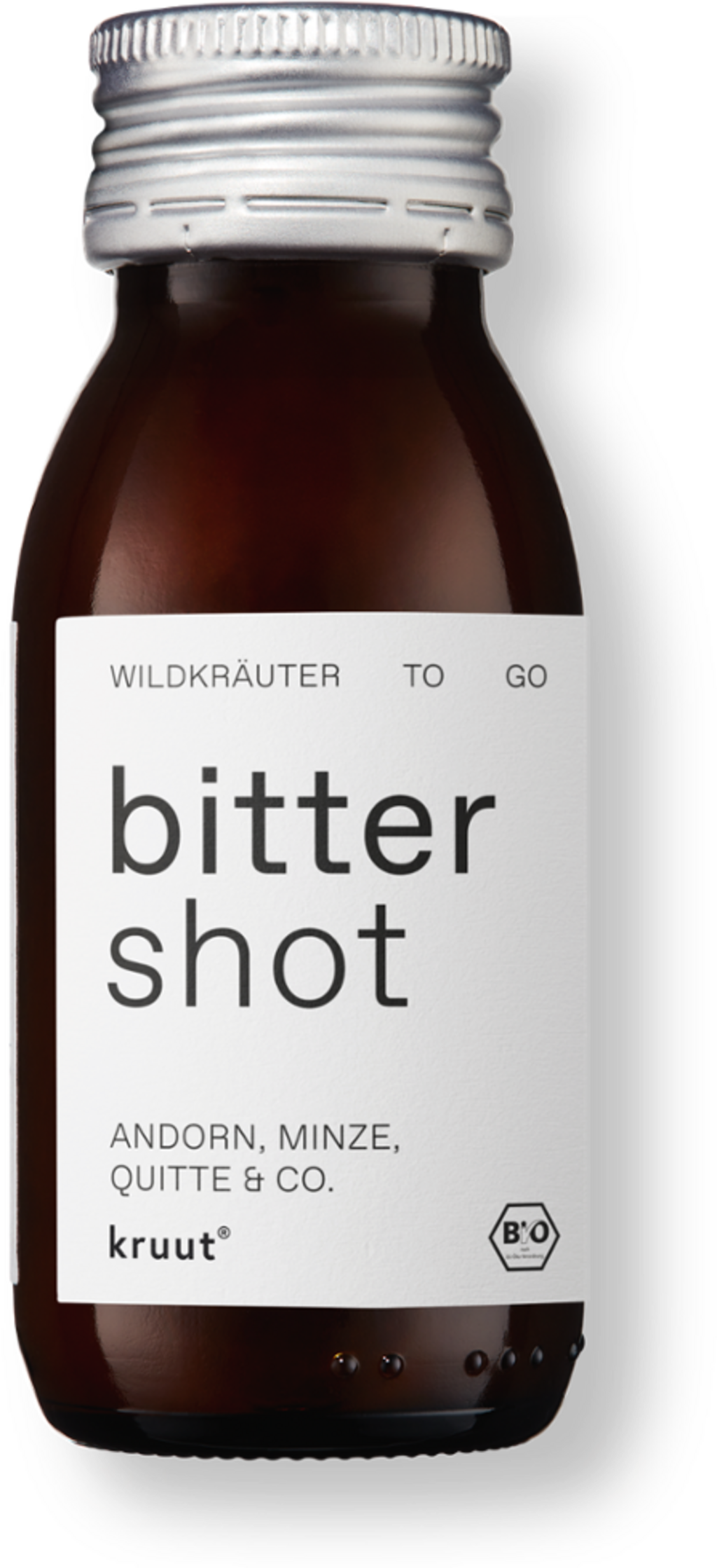 El Shot Bitter de kruut combina una receta probada a base de vinagre de manzana Demeter sin filtrar y miel de flores cruda con la dulzura afrutada del membrillo. La composición líquida contiene extractos de ajenjo, centaurea menor, marrubio y menta piperita.