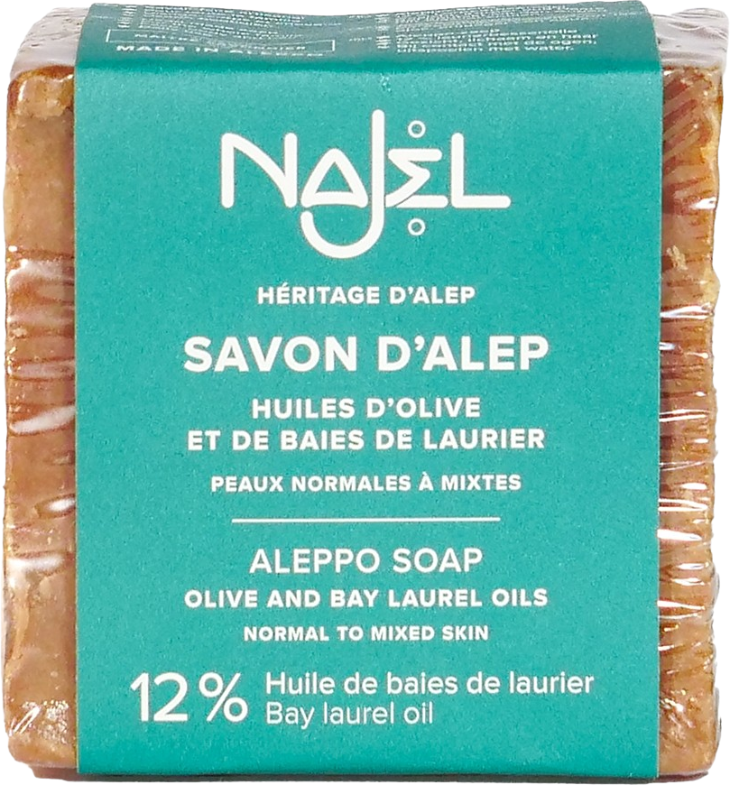 Este jabón de Alepo nutre e hidrata la piel gracias a la sinergia del aceite de oliva nutritivo y el aceite de laurel regenerador. La proporción de mezcla de los dos aceites hace que el jabón sea ideal para la limpieza diaria de pieles normales y mixtas. Contiene un 12% de aceite de laurel.