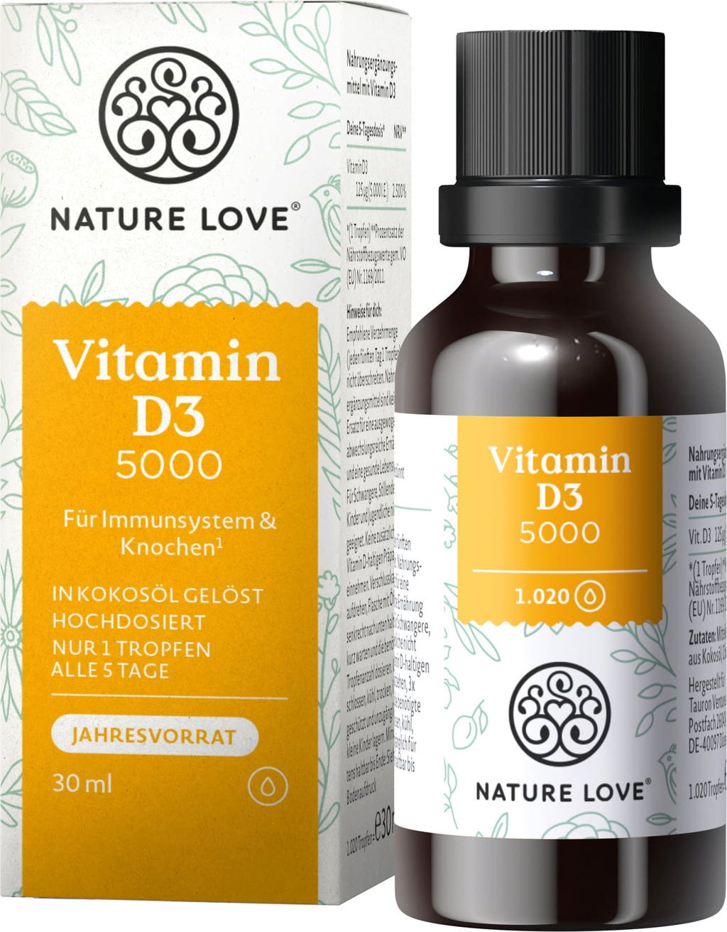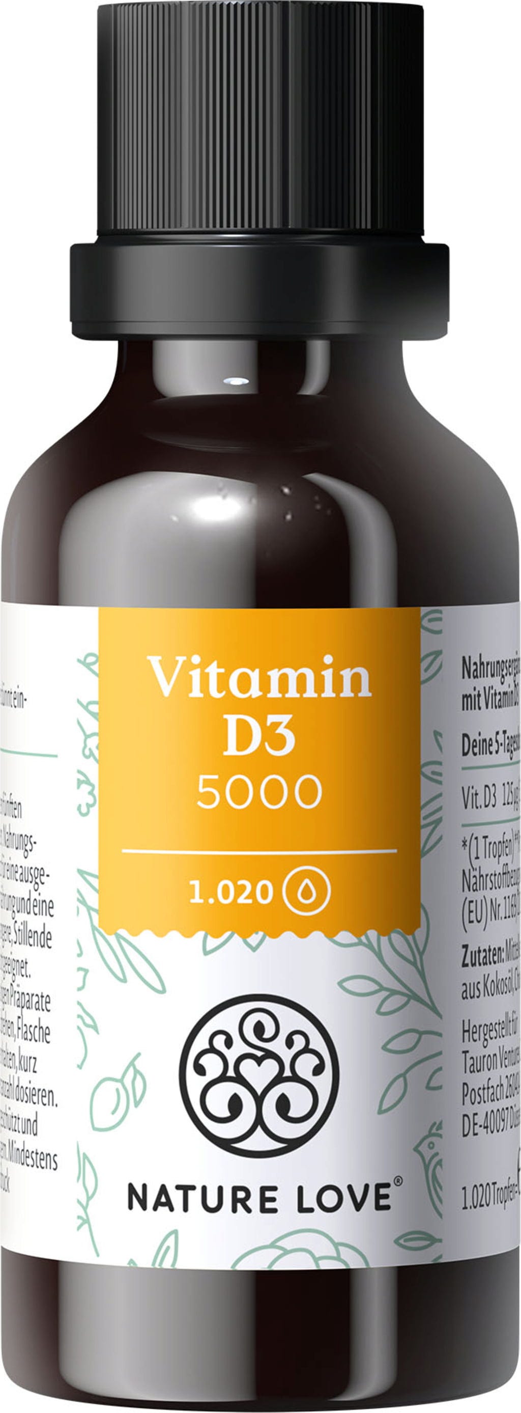 Con las gotas de vitamina D3 de Nature Love traes un poco de sol a tu hogar. Una gota de aceite contiene 125 µg (equivalente a 5000 UI) de vitamina D3 (colecalciferol).
