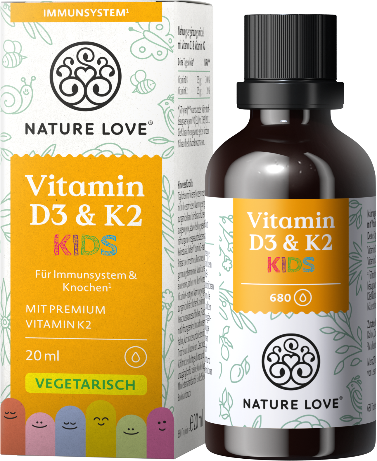 Los niños están en fase de crecimiento y les encanta estar en movimiento durante largos periodos de tiempo. Por lo tanto, un apoyo óptimo para vuestro organismo puede ser muy útil. Las gotas de vitamina D3 y K2 para niños de Nature Love ofrecen un apoyo óptimo en este sentido.