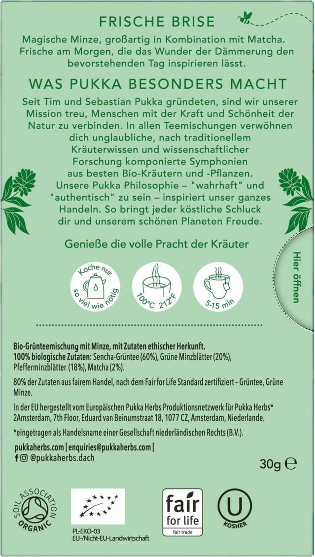 Este té verde único ha sido creado por los expertos herbolarios y nutricionistas de PUKKA, combinando los últimos descubrimientos científicos con los conocimientos tradicionales sobre hierbas. El resultado es una combinación sinérgica de menta ecológica, menta piperita, té verde sencha y matcha, que crea una taza equilibrada con aromas refrescantes y notas delicadas y ricas. Para una taza deliciosa y llena de sabor revitalizante.