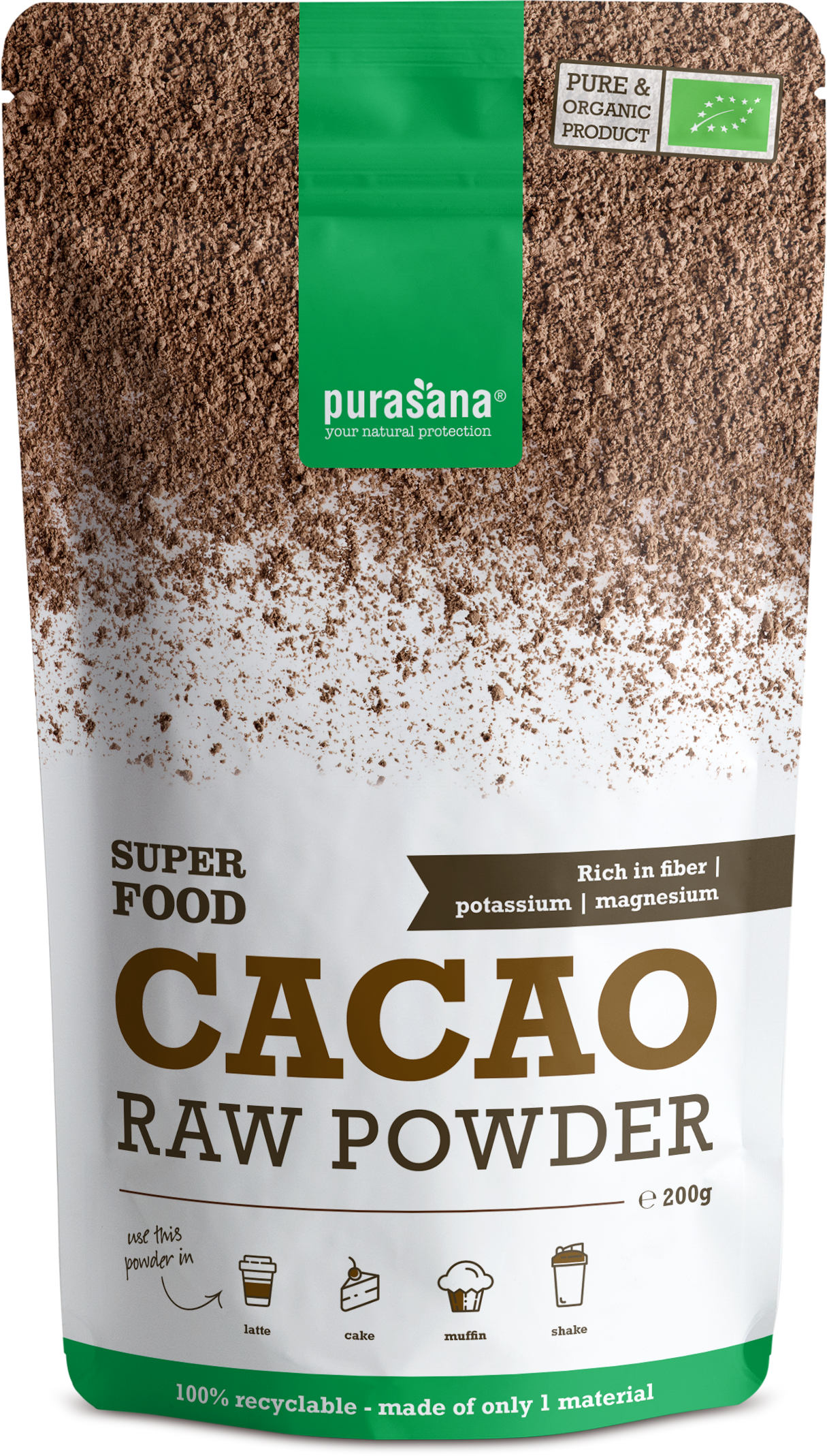 El cacao en polvo de Purasana se obtiene sin calentar las semillas de "Theobroma cacao". Es un pequeño árbol que crece en climas tropicales. El cacao contiene de forma natural muchos nutrientes especiales y fitoquímicos.