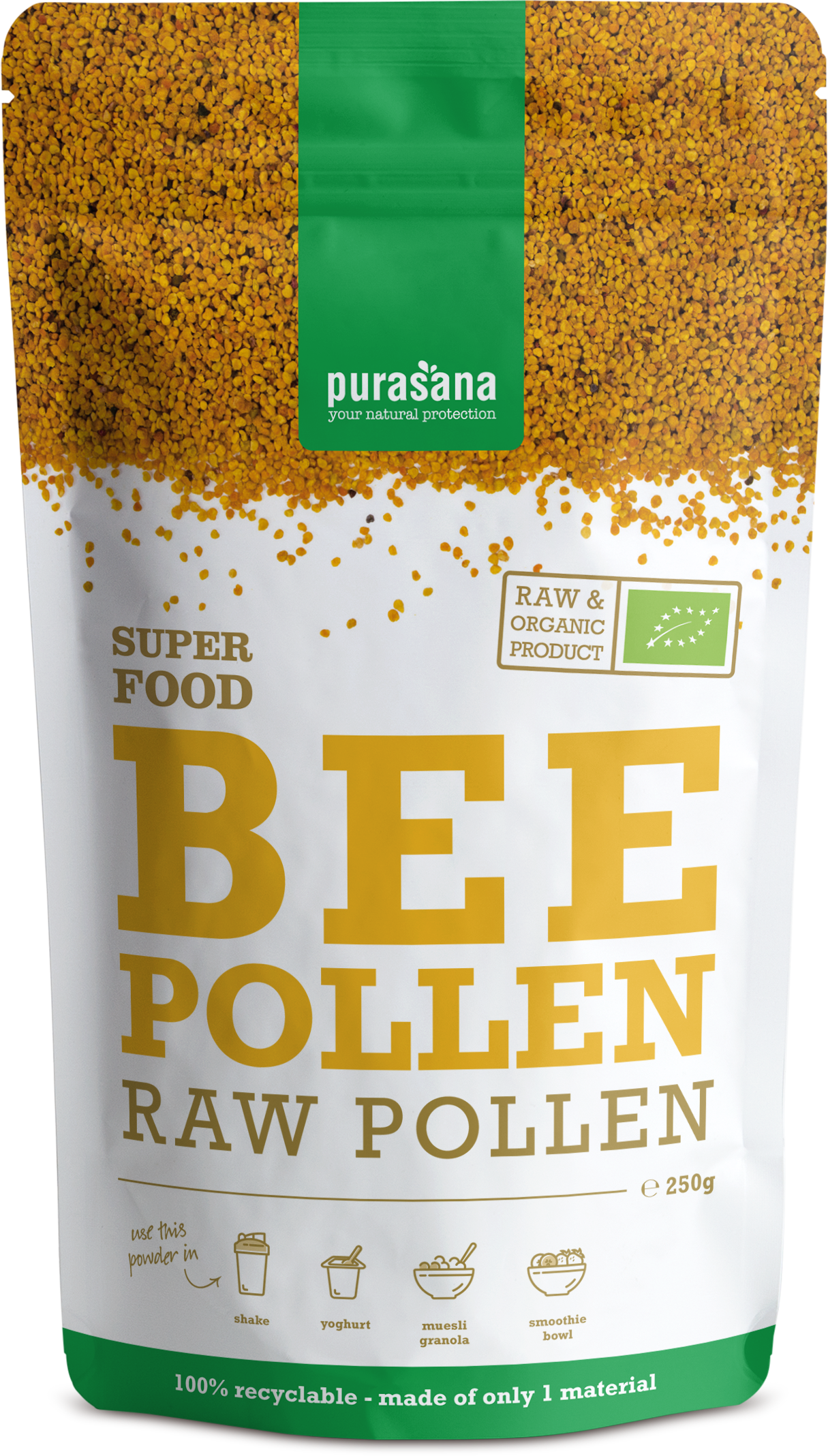 El polen de flores BIO de Purasana es recogido por las abejas. Éstas mezclan pequeñas semillas microscópicas con su néctar para formar pequeñas bolas. Como máximo se recoge el 50% del polen que se encuentra a la entrada de la colmena. Esto garantiza que se deja suficiente polen para la población de abejas. Debido a la abundancia de flores silvestres en los campos españoles, Purasana, incluye el polen de este país ya que es más puro y de mayor calidad. El polen de abejas contiene antioxidantes y aminoácidos esenciales que son ricos en vitaminas complex B. El polen de abeja no se debe cocinar.