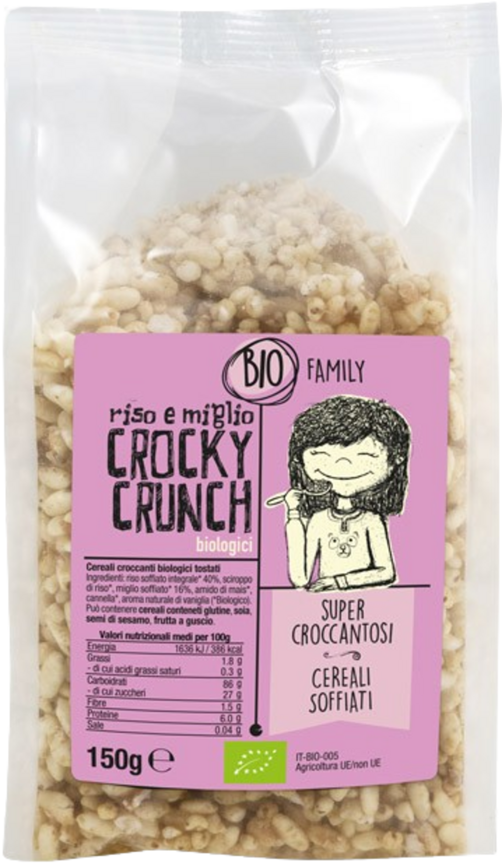 Arroz inflado y mijo, ligeramente endulzado con sirope de arroz y aromatizado con canela: ¡una experiencia de sabor verdaderamente crujiente! Junto con la leche, el zumo de frutas o el yogur, el Crocky Crunch Bio ofrece un desayuno saludable que te pone de buen humor y te deja una sensación de saciedad duradera.