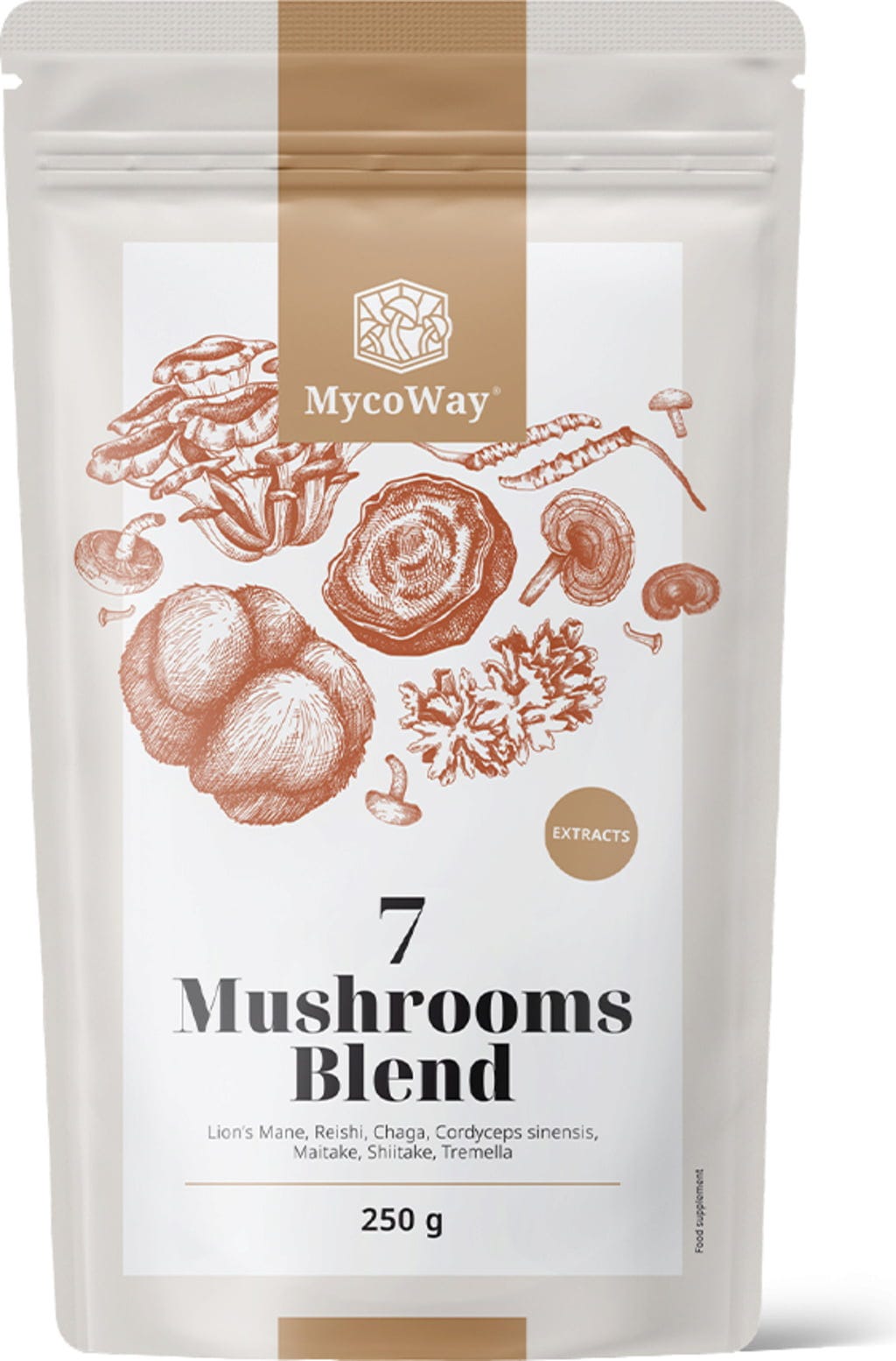 Esta fórmula combina extractos de siete hongos tradicionales en un solo polvo. Contiene melena de león, reishi, chaga, cordyceps sinensis, maitake, shiitake y tremella. Gracias al uso de extractos en proporciones de 4:1 y 12:1, esta mezcla ofrece una forma concentrada de los principios activos contenidos, claramente superior a los polvos de hongos comunes.