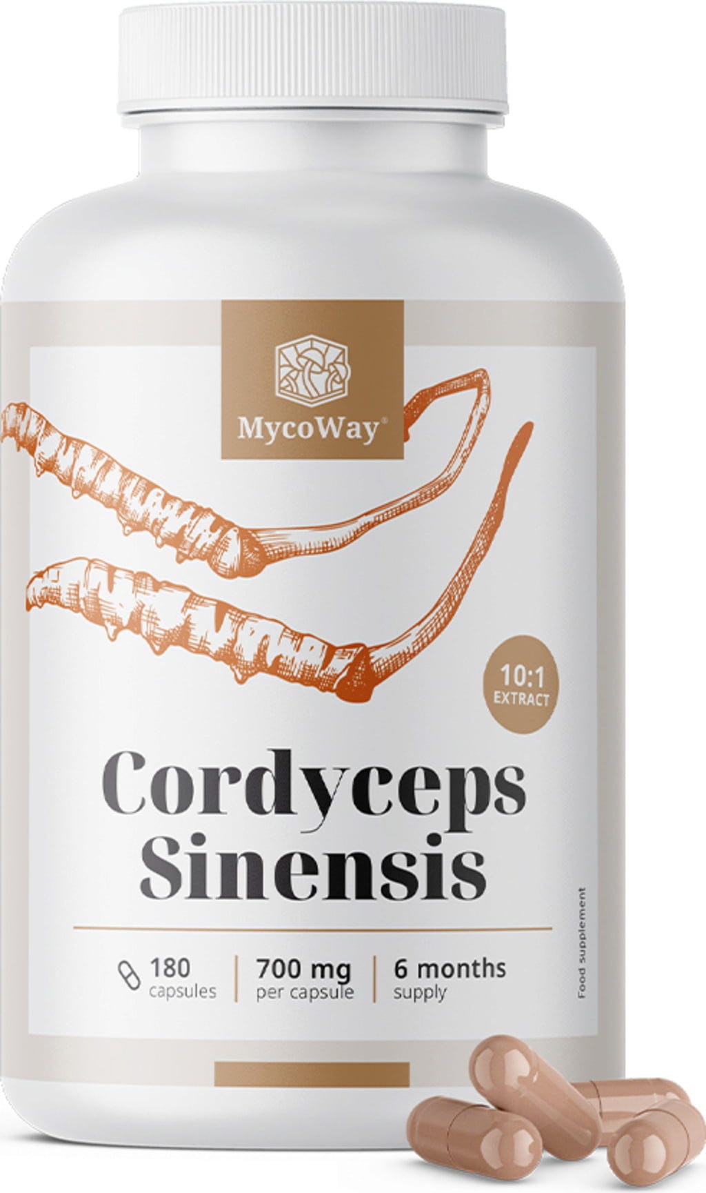 Las cápsulas MycoWay contienen un extracto de cordyceps cuidadosamente extraído, lo que hace que el hongo sea fácil de usar en un envase práctico. Las cápsulas eliminan la necesidad de preparación y permiten integrar fácilmente el producto en tu rutina diaria. Las prácticas cápsulas son fáciles de tragar con abundante agua, lo que las hace ideales para un estilo de vida activo.