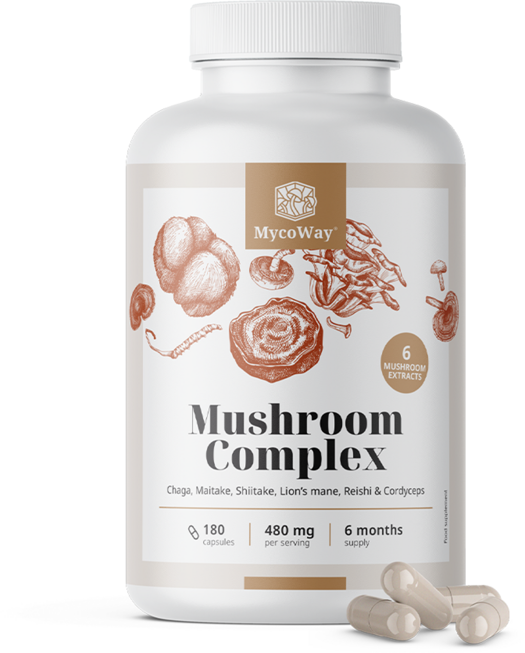 Este complejo reúne seis de los hongos más conocidos de la tradición asiática en forma concentrada: Chaga, Shiitake, Reishi, Maitake, Cordyceps y Melena de León (Hericium erinaceus). Esta combinación proporciona un amplio espectro de sustancias de origen vegetal, como los polisacáridos, apreciados desde hace siglos. La fórmula se completa con el aminoácido esencial L-leucina, para ofrecer un complemento versátil a la alimentación diaria.