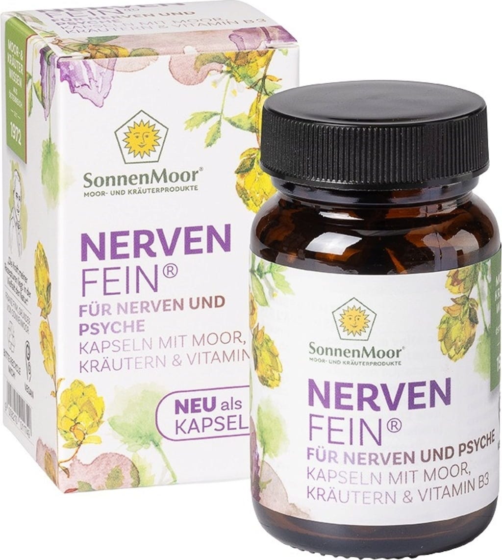Las cápsulas NervenFein de SonnenMoor combinan turba seca en polvo de la turbera Leopoldskron de Salzburgo con una selección de hierbas tradicionalmente apreciadas. La fórmula contiene una mezcla equilibrada de hojas de melisa, lúpulo y pasiflora. El polvo de turba contiene de forma natural ácidos húmicos y minerales como hierro, calcio y magnesio. Esta mezcla vegetal se completa con vitamina B3 (niacina).