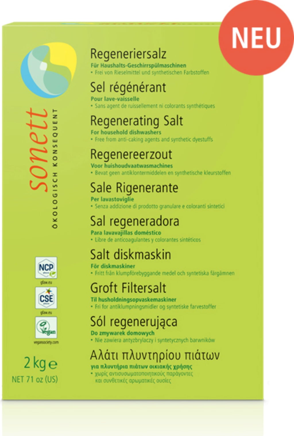 La sal regeneradora es adecuada para todos los lavavajillas estándar, es sal pura cristalizada sin antiaglomerante, colorantes sintéticos u otros aditivos. Esta sal asegura el intercambio de iones en el lavavajillas, evitando la formación de cal en vasos y platos.