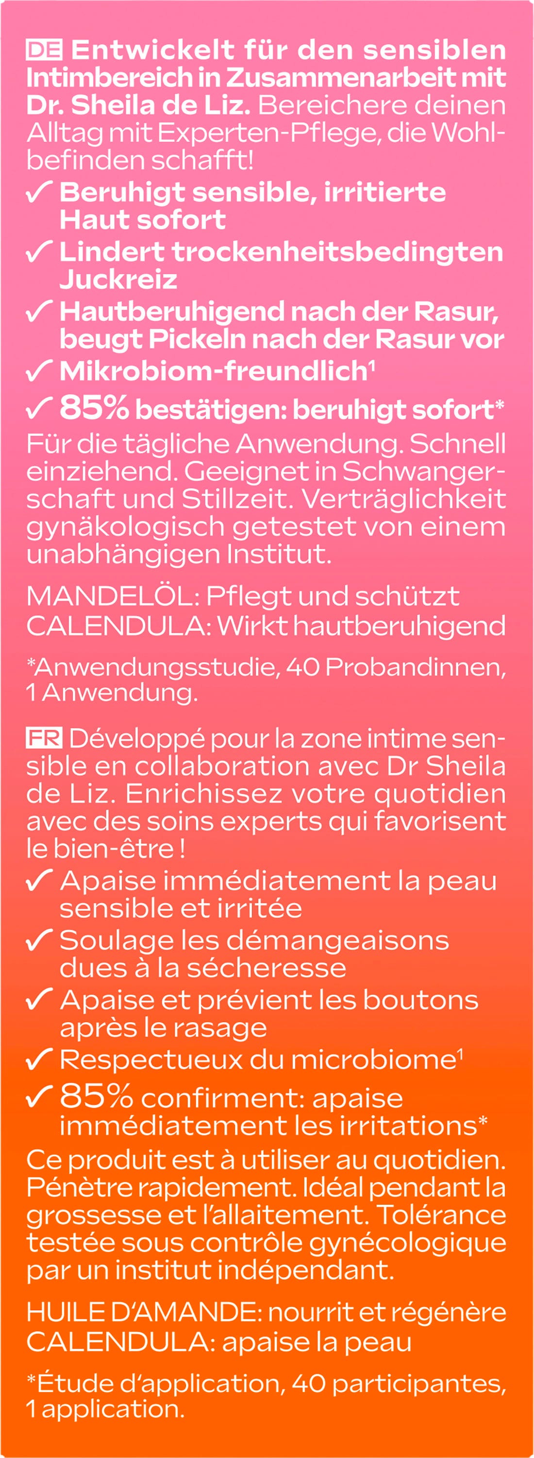 Desarrollados en colaboración con la experta Dra. Sheila de Liz especialmente para la sensible zona íntima, los vlora Gotas Extra-Suavizantes son ideales para el cuidado diario. Gracias a su fórmula respetuosa con el microbioma, el producto minimiza la sensación de sequedad y es adecuado para después del afeitado.